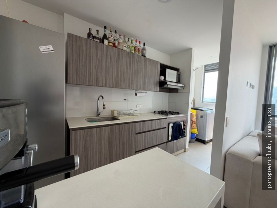 2 habitaciones, la principal con baño y Vestier, 2 baños en total, estudio, sala comedor, balcón con vista, cocina integral abierta con barra y zona de ropas. Parqueadero privado.